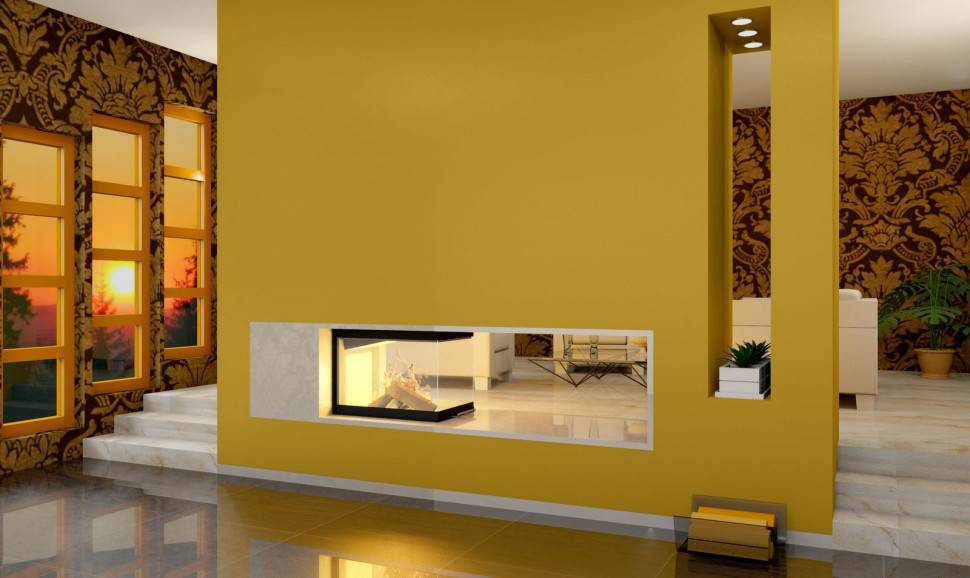 - Устраивать центральный камин нужно так, чтобы он не находился на маршруте следования по комнате. Можно смещать конструкцию в любую сторону, но до определенных пределов. Расстояние от корпуса камина до стены не должно сокращаться до одного метра. По тем же причинам следует удалить от камина все предметы, которые способны деформироваться от воздействия на них высокой температуры.
