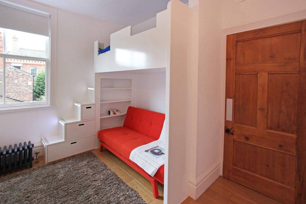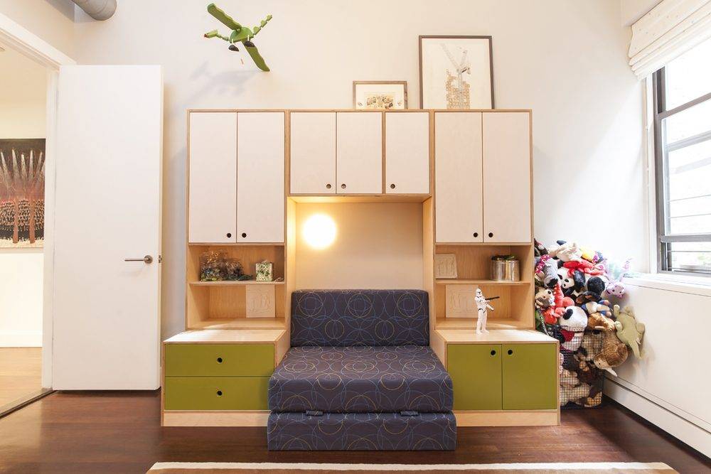 Диванчик, встроенный в шкаф. Такой вариант, к слову, популярен и среди взрослых, для обустройства спальни в малогабаритной однокомнатной квартире