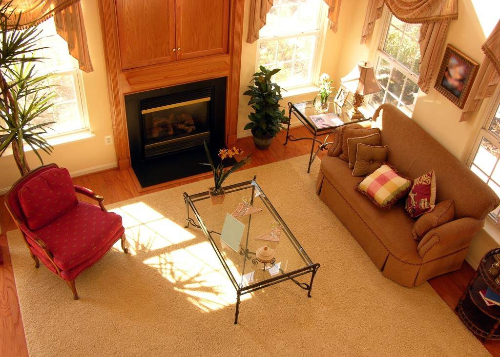 Основными предметами мебели в гостиной является диван и кресла. Диван должен стоят возле стены так, чтобы его спинка была повернута к глухой стене без окон. То же самое касается и кресел.