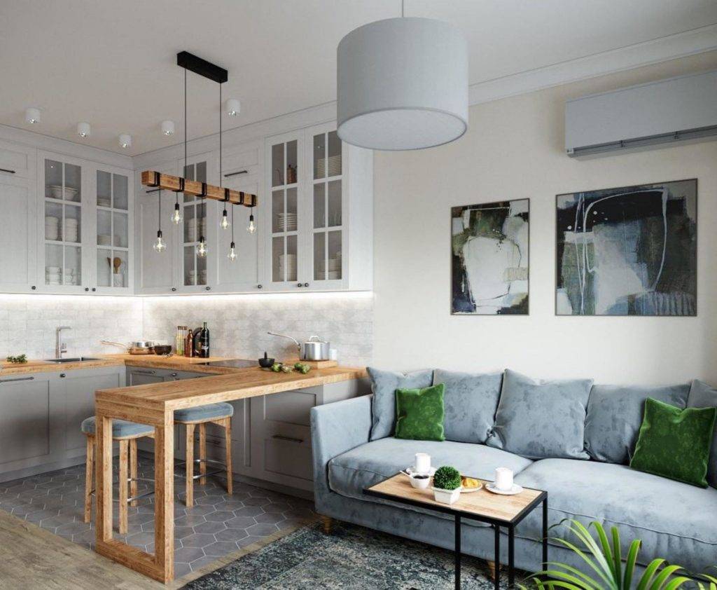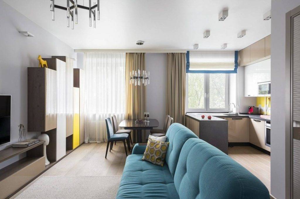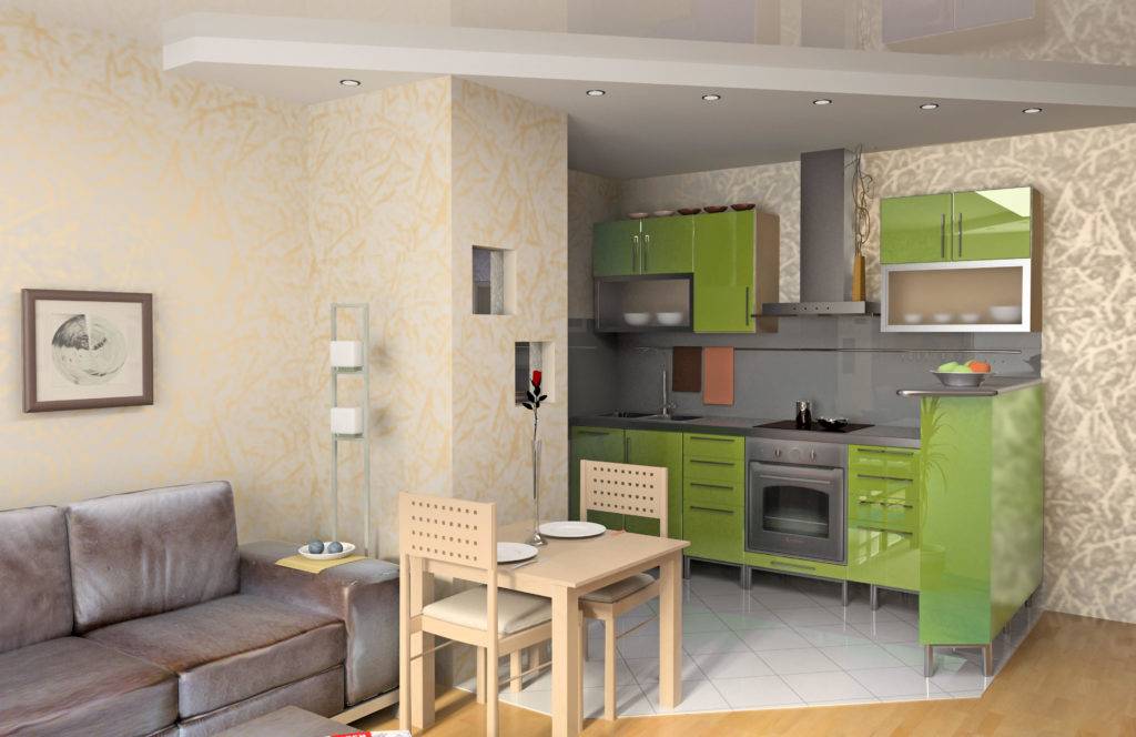 Например, ламинат и линолеум более нежный материал, который моментально не разбивает стеклянную посуду. Такое зонирование кухни и гостиной можно сделать применением разных оттенков одинакового материала. Границу между ними можно сделать диагонально или округло, оформив стык специальными соединяющими профилями.