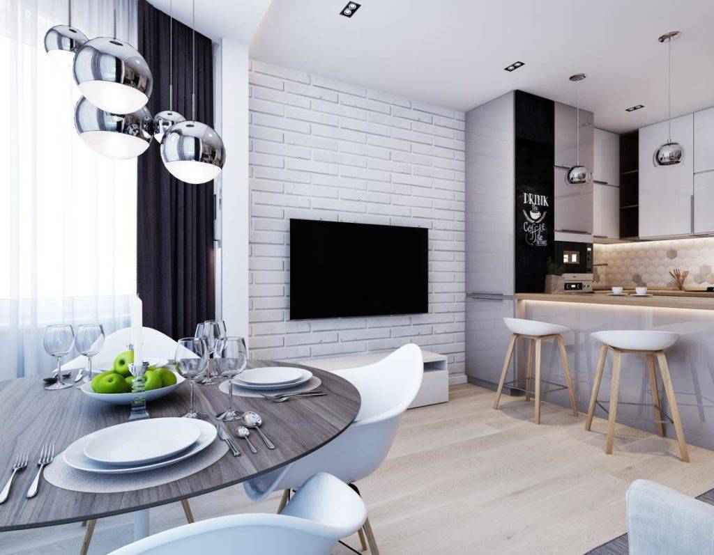 Отделка стен может выполняться различными материалами: окрашивание, побелка, наклеивание обоев или панелей. Главное подобрать подходящие расцветки, для резкого или плавного перехода. В кухоньке используют материалы, которые просто моются и не впитывают загрязнения. Для зала подойдут любая отделка с различными принтами или фотообоями.