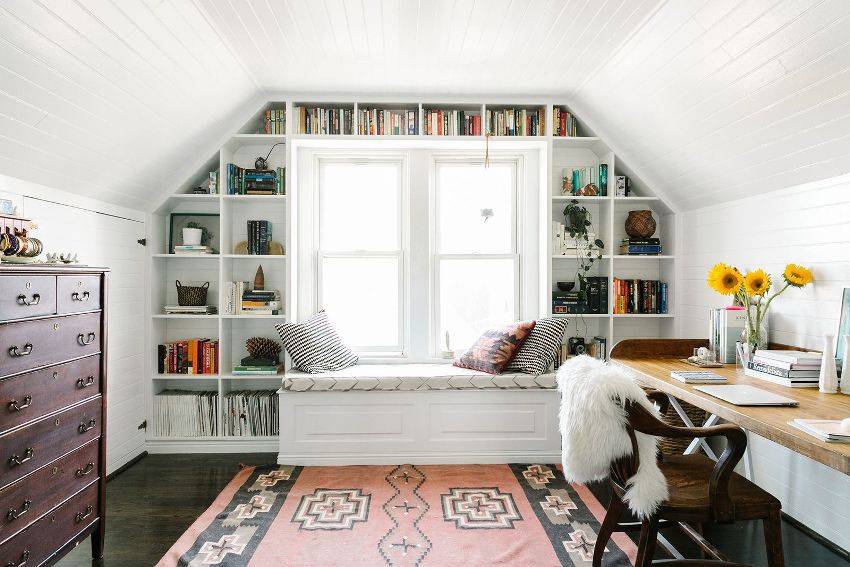 При подборе грамотного дизайна на мансардном этаже легко создать загадочную атмосферу. Например, при выборе отделки в эко-стиле или рустик можно завесить окна фонариками, задрапировать тонким тюлем, оснастить подоконники подушками и создать идеальную релакс-зону. Еще одна хорошая идея для отделки пространства вокруг окон в квартире с мансардой – организация стеллажей под книги, декор или детские игрушки.