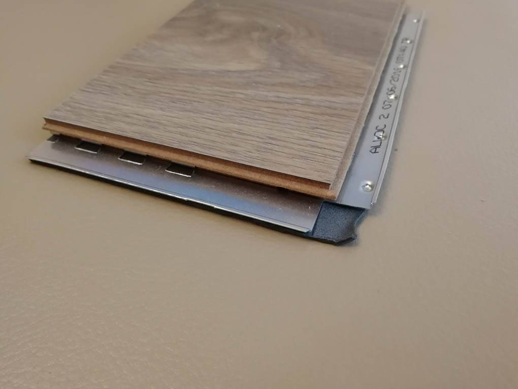 Устройство запирания замка Alloc основано на соединении планок посредством металлической пластины, врезанной в каждую панель с нижней стороны по длинной и короткой части. Соответственно, вся нагрузка на разрыв приходится на алюминиевый бортик детали – более прочный, чем любой HDF.