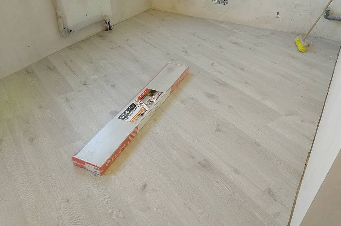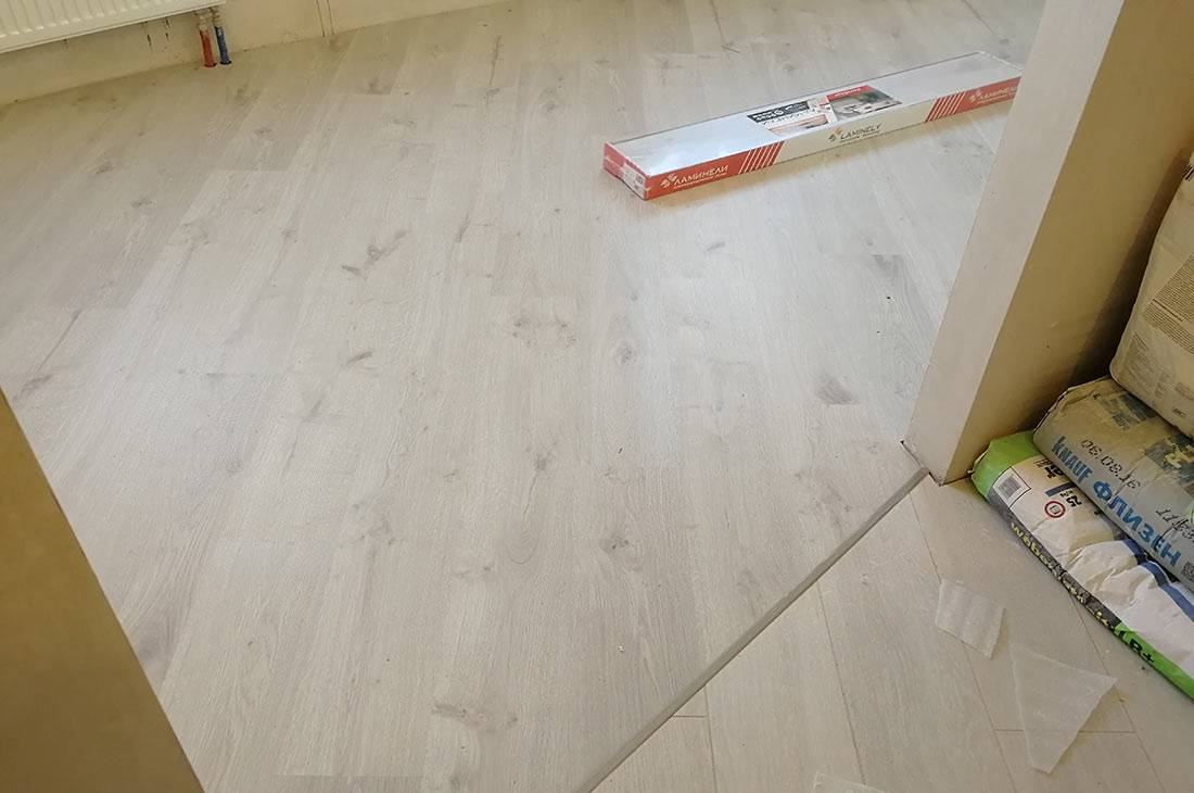 Заказчик попросил настилать пол по диагонали для визуального продолжения кафельной плитки в коридоре. Поэтому было принято решение начинать укладку Ламинели с середины помещения, от дверного проема, и продолжать в обе стороны.