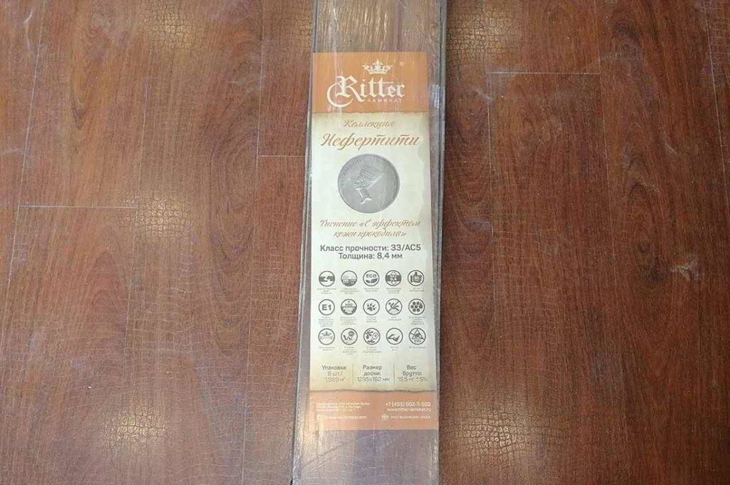 У компании «Ламинат-Трейд», выпускающей продукцию Риттер произошла какая-то путаница с коллекциями. Укладываемый нами ламинированный пол 8 мм, указано на упаковке, коллекции «Нефертити». Но цвет «огненный махагон» представлен только в серии 12 мм «Ганнибал».