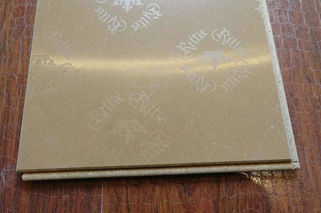 Ламинат Риттер Нефертити обладает тиснением, стилизованным под кожу крокодила. Фактурная поверхность в значительной мере предотвращает скольжение. На обратной стороне нанесена стабилизирующая пленка. В нашем случае это помогло, ламинированные планки были ровные.