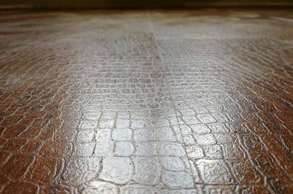 Поверхность может имитировать кожу, на которой имеются вкрапления, что подчеркнет стиль помещения, привлекая внимание присутствующих к определенным участкам пола.