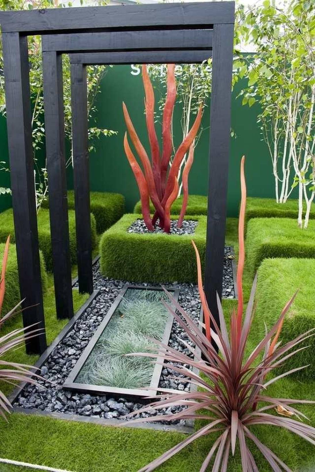 - четких требований к растениям нет. Можно использовать иву, березу, клен, хвойные и плодовые деревья, из кустарников подойдут форзиция, снежноягодник, спирея. Отлично будет смотреться вертикальное озеленение, из цветов подойдут ромашка, ирисы, злаки, папоротник, примула, бархатцы;