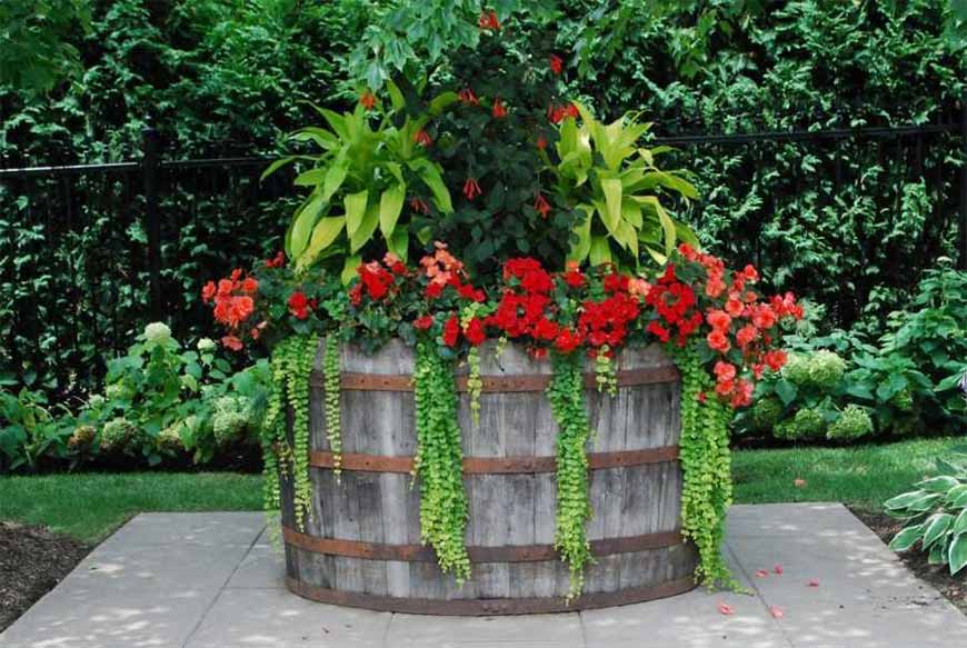 - изменения рельефа добиваются при помощи высоких грядок, подвесных кашпо или огромных вазонов;