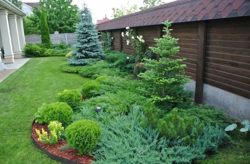 - коническая — ель обыкновенная, ель «Коника», можжевельник обыкновенный;