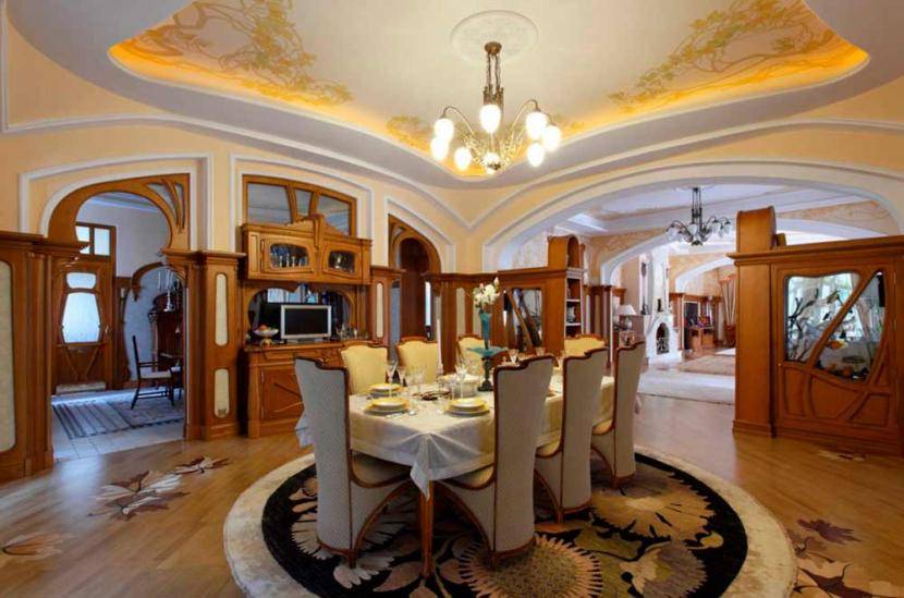 В современном стиле. Выбор зависит от настроя владельцев. Проверенный вариант – строгие, без излишеств, классические формы, но можно поэкспериментировать и сделать потолок значимым элементом интерьера при помощи оригинального выбора лепнины.