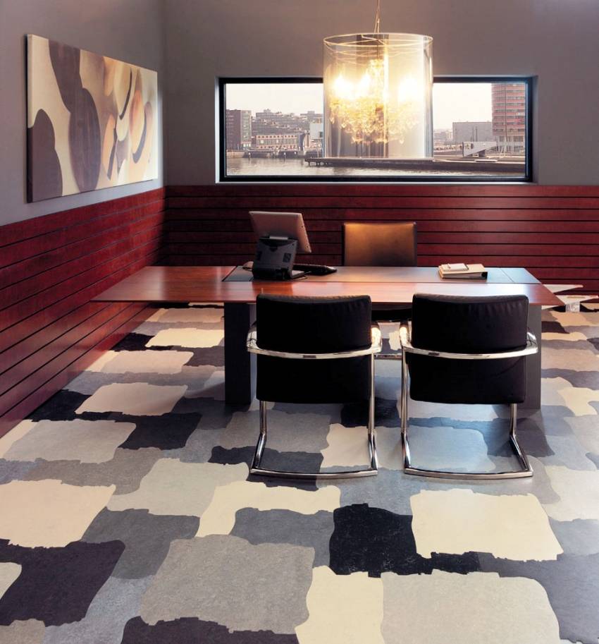 В офисах и магазинах с небольшой проходимостью лучше использовать полукоммерческий линолеум. Материал имеет гетерогенную структуру, а за сохранение декоративных качеств отвечает дополнительный защитный слой из акрилового или полиуретанового лака.
