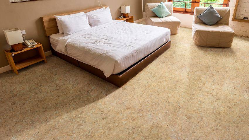 Принимая во внимание, что гомогенный линолеум характеризуется жесткостью, высоким классом по истираемости и отсутствием подложки, в жилых помещениях его используют реже и только в помещениях со значительной нагрузкой на основу. Напольное покрытие данного вида имеет богатый состав: ПВХ, пластификаторы, известь, мел, кварцевый песок, доломит