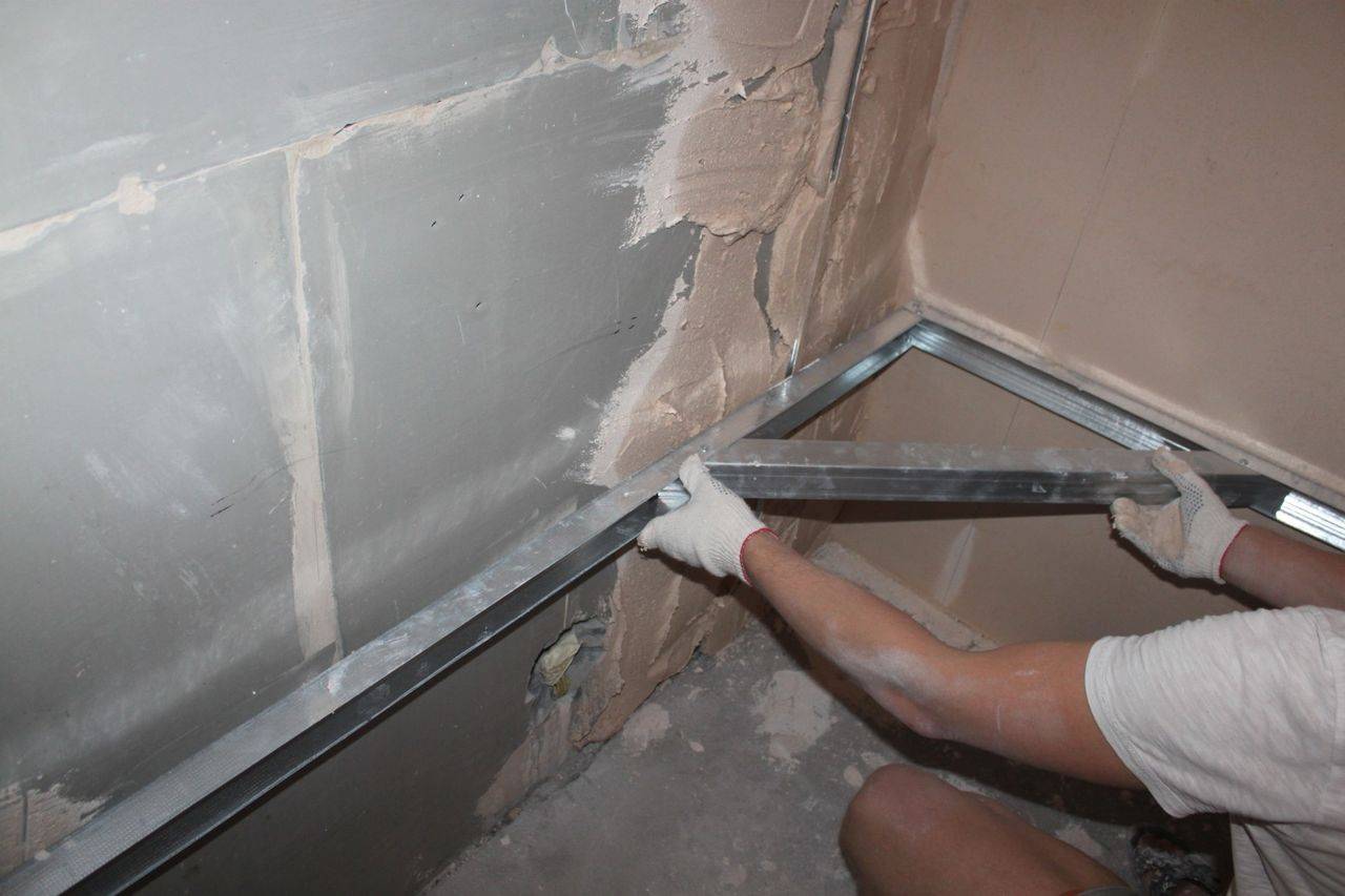 - С обоих углов стены нужно уступить десять сантиметров, от потолочного покрытия оставляют 15-20 сантиметров, так получают первые точки, в которые вкручиваются саморезы. Они должны выступать на три-пять сантиметров.