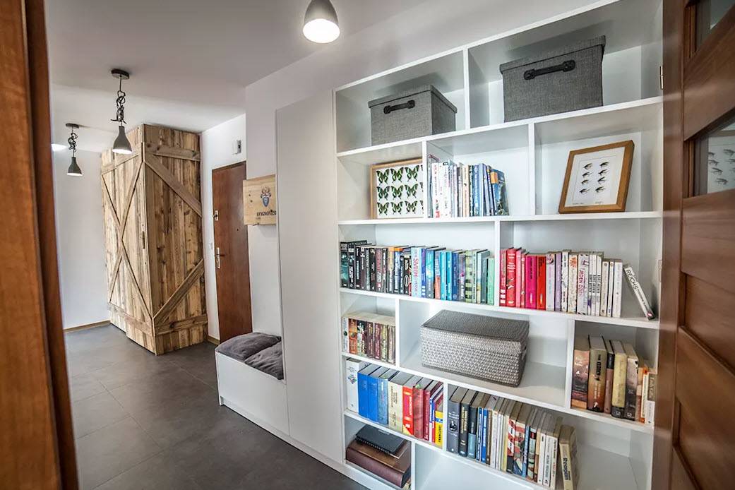 Начните с простой идеи или размещения книжного шкафа. Независимо от того, насколько сужен ваш коридор или прихожая, книжный шкаф всегда будет соответствовать. Вы можете использовать такую полку для хранения самых важных вещей или для украшения пространства. Поставьте здесь фотографии, книги или праздничные сувениры.