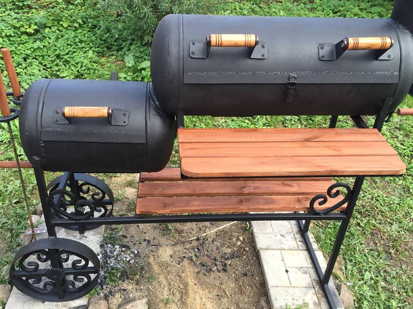 Фото 1. Готовое барбекю из газового баллона с двумя отделениями: маленьким и большим. Рядом с устройством приделан деревянный столик.