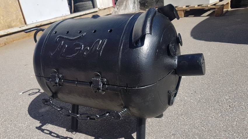 Мангал, который изготовлен из газового баллона, может служить также коптильней и барбекю. Если на обычной стандартной жаровне мясо просто жарится, то в данном случае оно ещё и печётся благодаря особенной конструкции изделия. Даже при использовании небольшого количества углей стенки мангала хорошо прогреются и мясо полностью прожарится.
