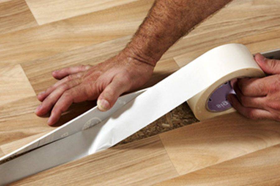 - Обрезки выбрасываем. На всю длину стыка клеим малярный скотч, прорезаем его по месту стыковки. Скотч защитит материал от загрязнения клеем.