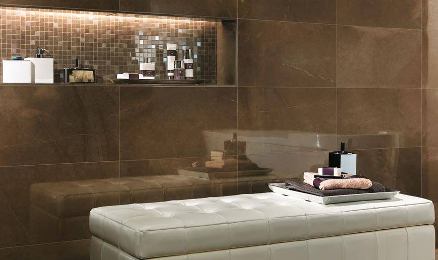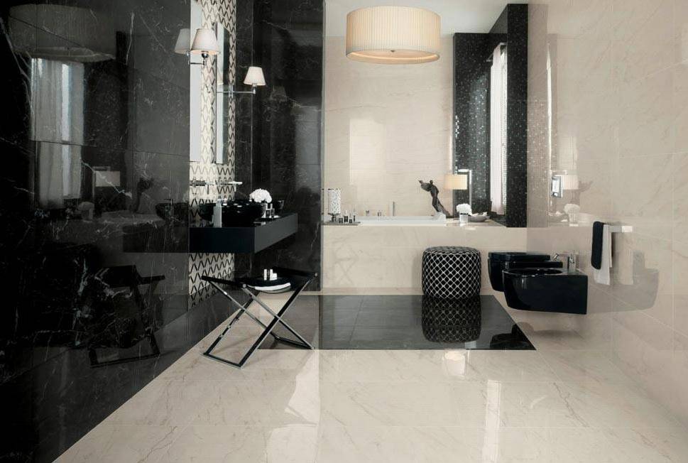 блеск придает эстетичность помещению; глянцевая поверхность отражает свет, и комната становится светлее (это важно при недостатке светильников); даже темная плитка увеличивает ванную комнату; простота в уходе, легкость чистки