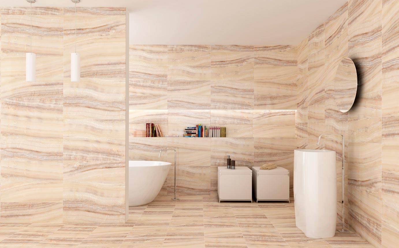 Помещения средних габаритов можно оформить мрамором горчичного, терракотового, розового оттенков.