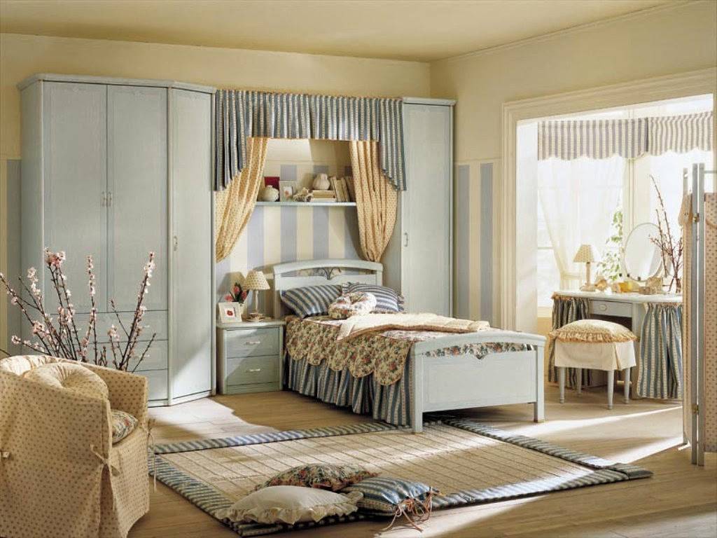 Придать комнате изящества можно с помощью декоративных подушек с вышивкой, кружевных занавесок, покрывала с цветочным орнаментом и мелкой стежкой, наволочек с рюшами, салфеток «макраме», чехлов для стульев из ситца и льна. Не стоит использовать синтетические ткани ярких расцветок, а также ткани, декорированные камнями и золотым шитьем.
