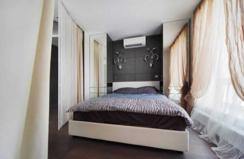 Встроенная мебель. Требует создания в спальне специальных ниш для установки шкафа или целой секции. Дверцы декорируются зеркалами, расписным стеклом или повторяют фурнитуру отделки стен.