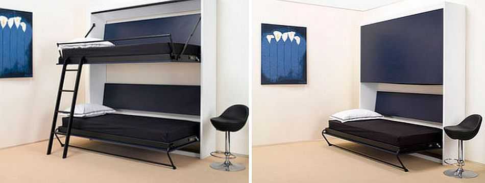По такому же типу устроены двухъярусные шкафы-кровати. В них два отдельных спальных места располагаются одно над другим. В собранном виде они похожи на шкаф.