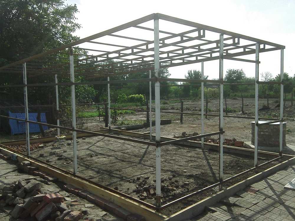 Стоимость такой постройки намного меньше, чем у кирпичных, но не уступает и деревянным аналогам, потому сарай из профильной трубы своими руками выгодно возводить с экономической точки зрения.