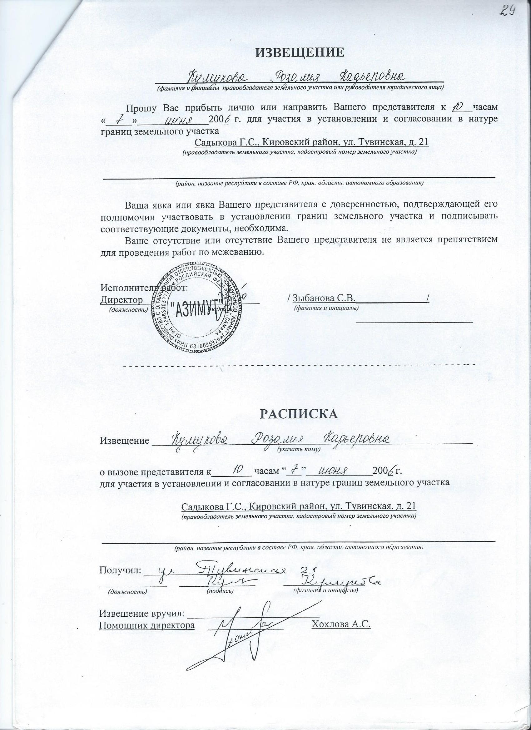 - Фамилии и инициалы всех заинтересованных в согласовании лиц. Это касается как исполнителя работ, то есть кадастрового инженера, так и всех владельцев или арендаторов соседних участков, которые должны дать свое согласие на установление границ. Если личное присутствие данных лиц невозможно, они могут прислать вместо себя своего законного представителя (то есть доверенное лицо).