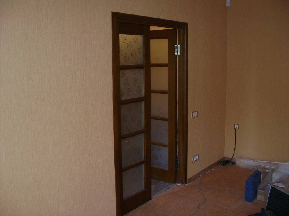 - Двери складные. Удобство таких моделей очевидно, причем несложно выбрать подходящий вариант. Например, «гармошку» с несколькими секциями или «книжку», у которой всего 2 створки. Существенный недостаток всех изделий данной группы – недолговечность из-за наличия множества подвижных элементов. Да и прочность таких дверей минимальная.