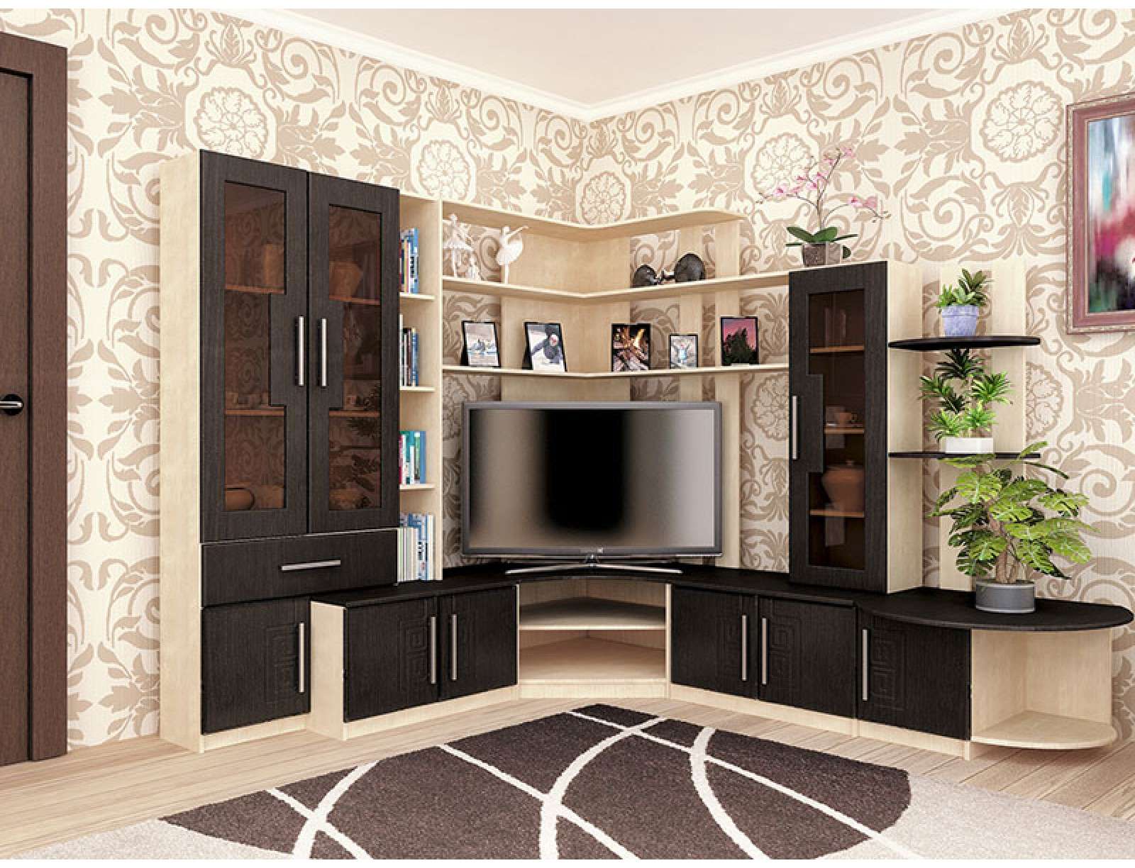 Угловые мини-стенки идеально подходят для малогабаритной комнаты. Как правило, такой гарнитур занимает две стены или выступает на вторую лишь частично. Обязательное условие – наличие углового шкафа или пенала. Комплект считается максимально вместительным при рациональной затрате площади, поскольку самая массивная часть занимает глухое угловое место, которое обычно заставляют торшером, ширмой или декоративным растением. Как модульные, так и корпусные модели одинаково популярны.