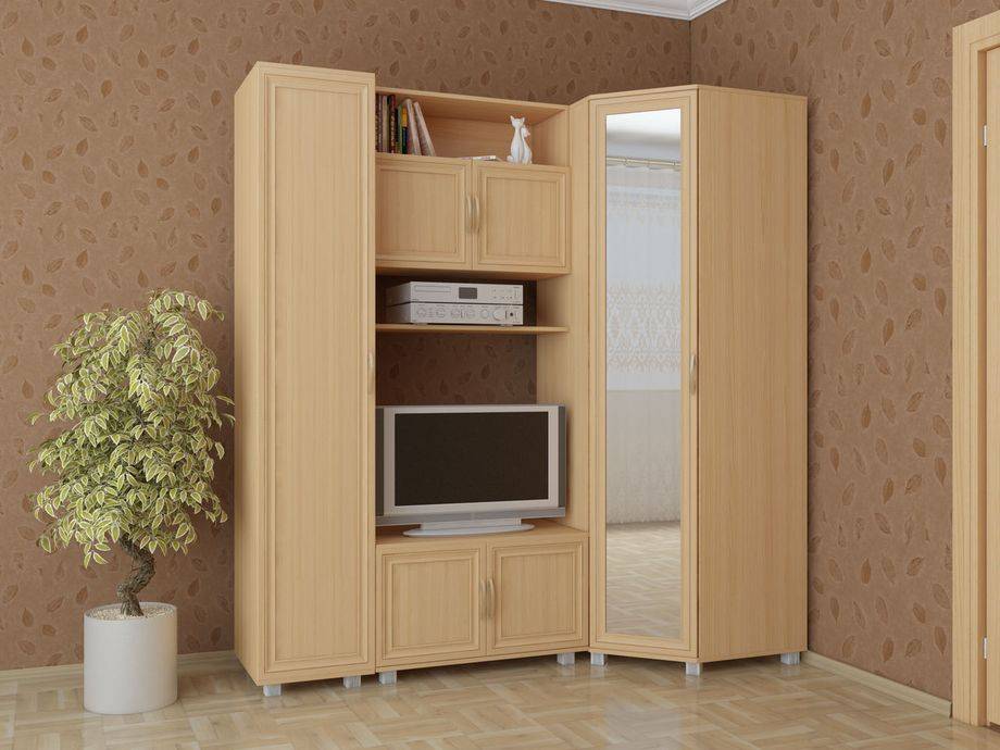 Угловые стенки устанавливаются в больших комнатах. Они занимают много места и трудно поддаются трансформации. Шкаф, закрывающий угол, нельзя двигать или переставлять. Фактически он становится центром композиции, а переставлять отдельные модули можно только вокруг него. Сделать хороший дизайнерский проект угловой стенки не так просто.