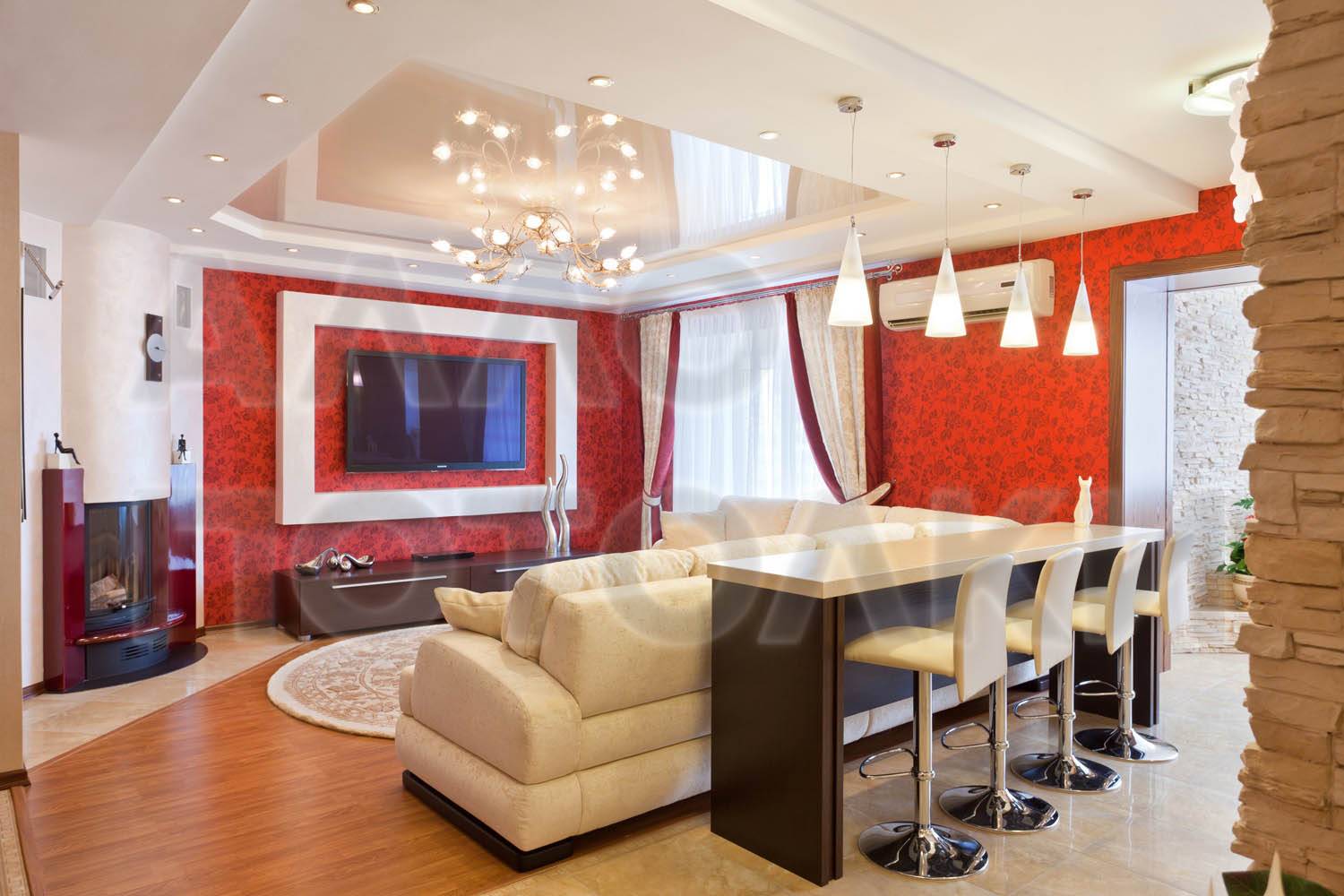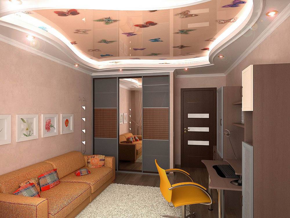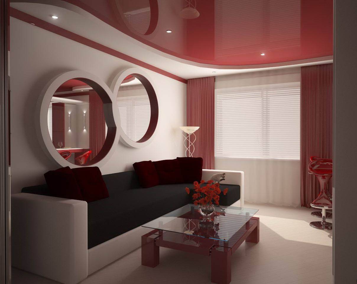 Если вы планируете дизайн потолка в студии, вам потребуется потолок с переходом, который будет зонировать помещение. Переход выделяется с помощью разных уровней и цветов.