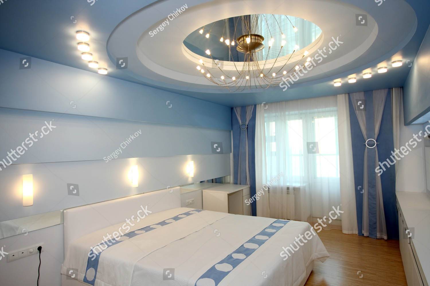 Потолок может выступать в роли основного звена композиции, которое привлекает к себе все внимание. Освещение должно быть практически незаметным и только выделять общие контуры ярусов. Оптимально использование маленьких точечных светильников, которые будут подчеркивать внешний угол полотна