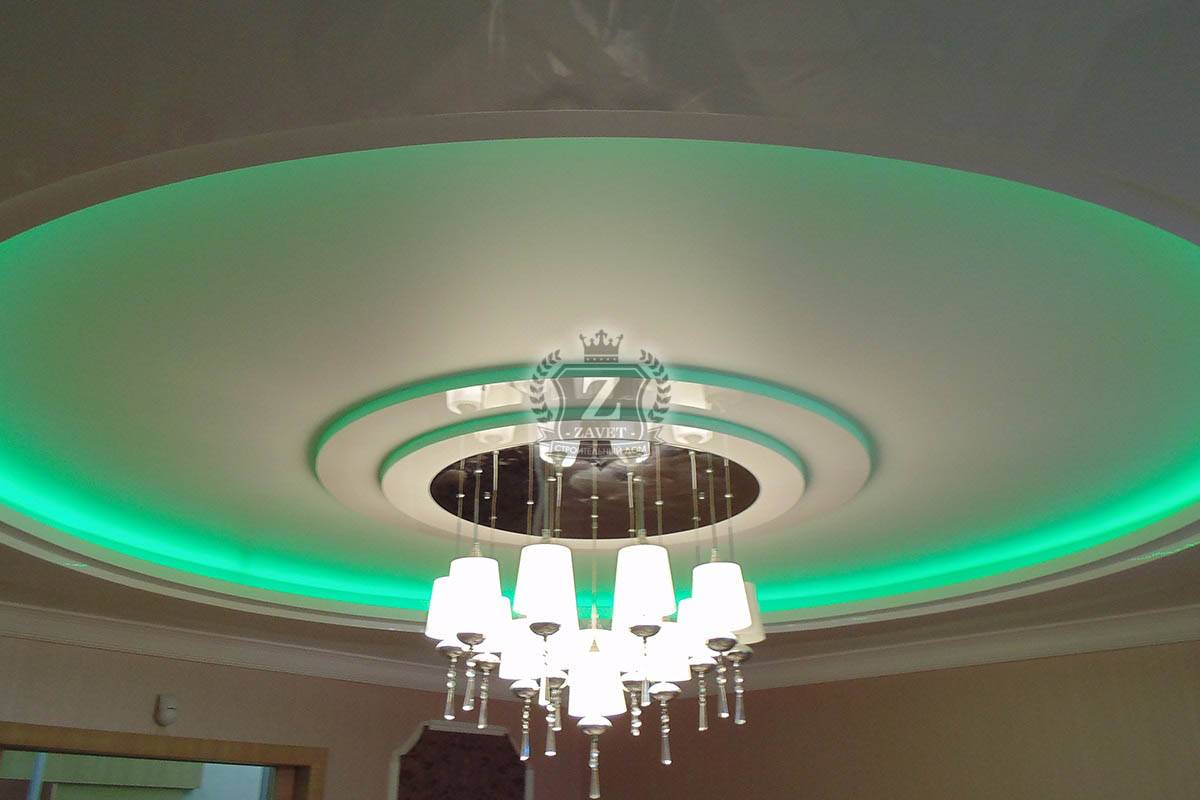 Подиум под люстру. При установке крупногабаритного осветительного прибора лучше четко обозначить место под его размещение – это центральная часть потолка.
