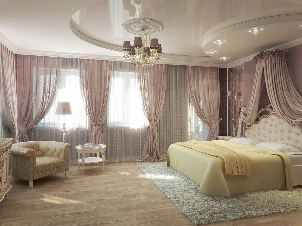 В таком стиле хорошо смотрятся потолки, в которых присутствуют округлые и плавные формы в паре с четкими и ровными линиями. Для углов следует выбирать простое оформление. Для завершения образа можно использовать лепнину, которую помещают на стену.
