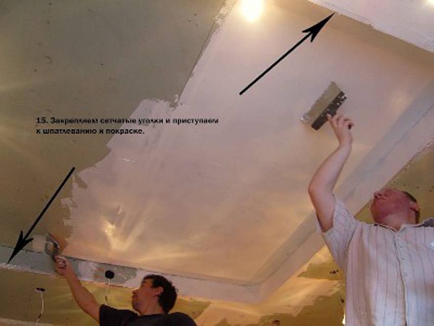То же самое сделать закрепив гипсокартонную конструкцию на боковых направляющих. Затем уголки закрепить по перпендикулярным граням низшего потолка и вертикальной внутренней стенке. Зашпаклевать стыки.