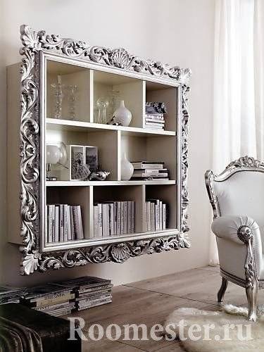 Кроме вышеописанных способов молдинги могут применяться не совсем в традиционном понимании. Из данного материала получаются диковинные полочки для книг или прочих мелочей. Для данных целей применяется широкая, выпуклая планка небольшой длины. Это могут быть единичные экземпляры, может быть композиция, например в углу комнаты. Данное решение выглядит эстетично, экономит пространство. По примеру полок для книг можно оборудовать места для фото, маленьких цветочных ваз, место для ключей.