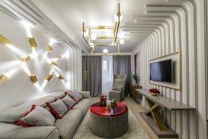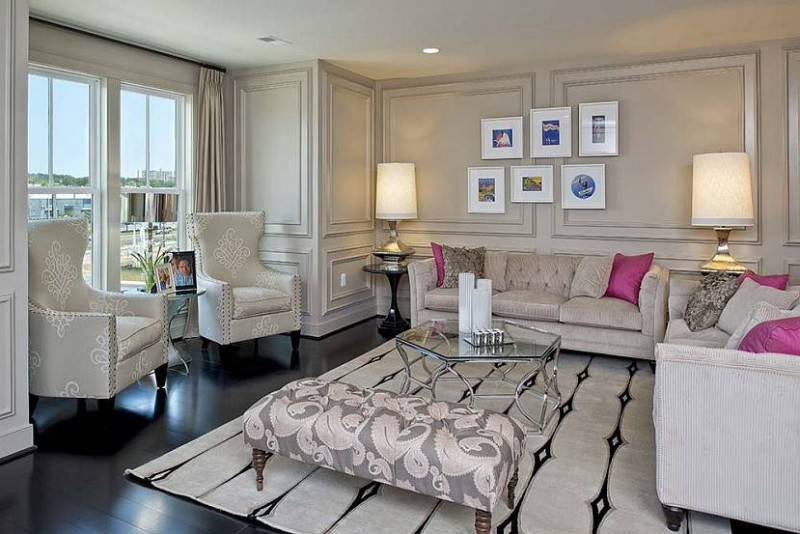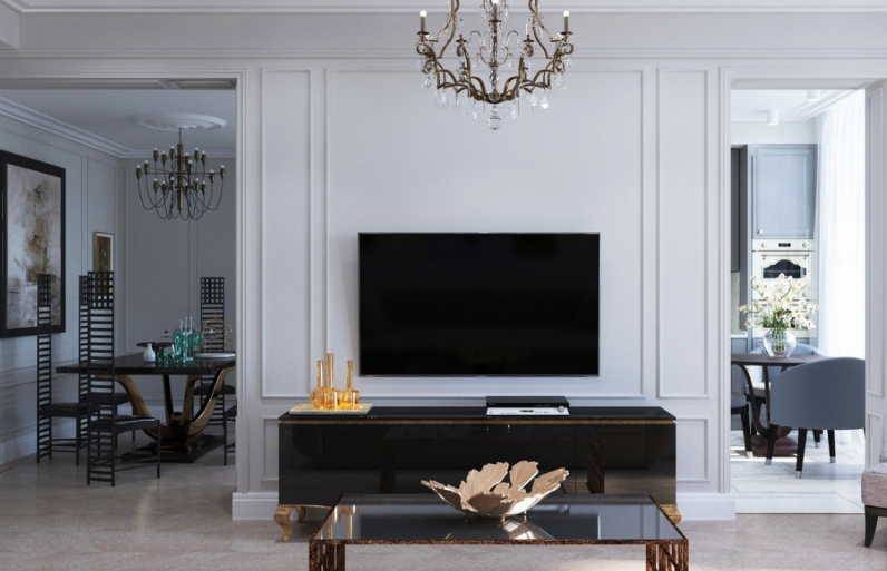 Все эти приемы декорирования требуют большого пространства, иначе помещение получается слишком «перегруженным». В маленьких комнатах если и используют, то обычно только планки на стыке стены и потолка, да может пару тонких полос для разделения разных фактур или цветов. Чаще всего можно увидеть молдинги в интерьере гостиной — эти комнаты обычно наиболее просторные. Неплохо смотрятся молдинги в спальнях, но только не в маленьких, а хотя бы средних.