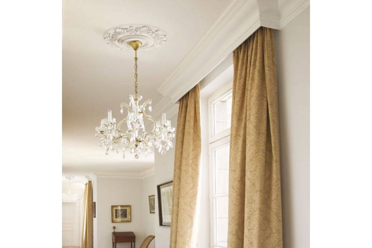 Потолочные изделия предназначены для оформления аккуратного стыка между потолком и стеной. Бывают 2 видов: сложные и простые, а делаются они с лепниной и разными рисунками. Их ширина может быть различной в зависимости от стиля интерьера. Для высоких помещений применяют широкие молдинги, в маленьких — более простые вариации.