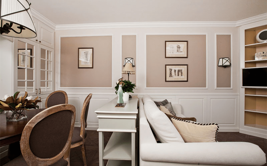 Для отграничения одной из зон помещения используют обои с молдингом в интерьере. Для этого необходимо подобрать обои и подходящий к ним молдинг, затем сделать выделение, обрамив часть стены.