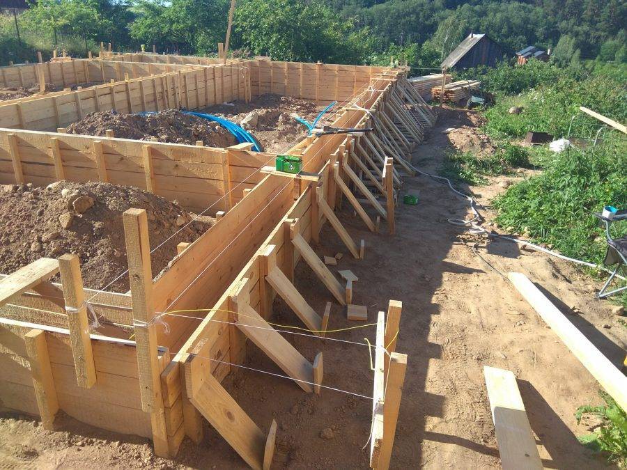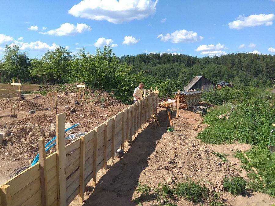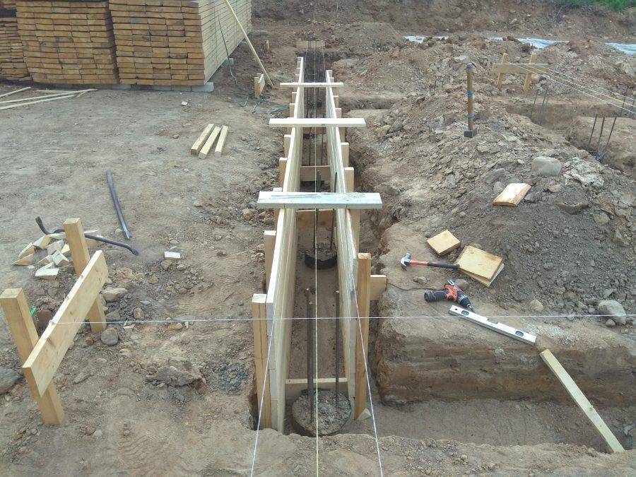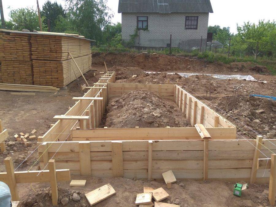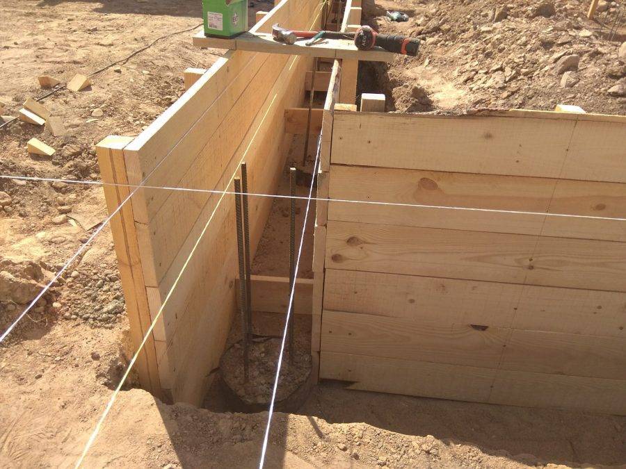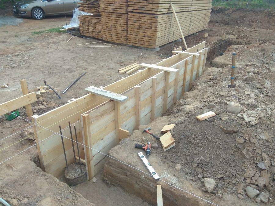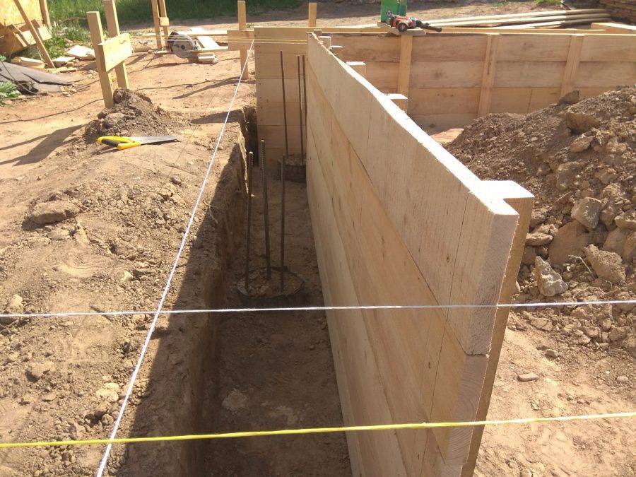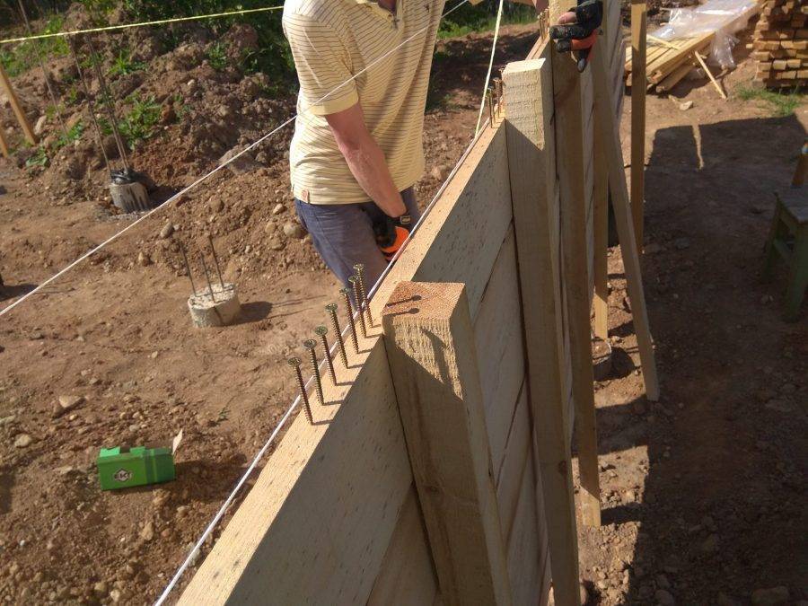Сборка и монтаж опалубки. Для монтажа опалубки подготавливают щиты из досок. Стенка щита при установке опалубки должна быть строго вертикальна, край досок при этом должен быть выше заливки опалубки на 5–10 см. Щиты скрепляют между собой саморезами или гвоздями и монтируют в траншее с помощью распорок и колышков