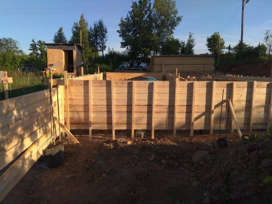 Высота боковых пластин опалубки должна превышать глубину котлована на 5-10 см, чтобы рабочий состав не выливался на поверхность прилежащего участка почвы. Обязательно монтируют горизонтальные перекладины, которые придают дополнительную прочность конструкции.