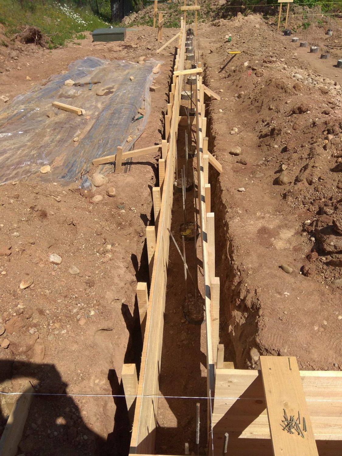 - Земляные работы. По шнуру выкапывают траншею на глубину заложения фундамента. Ширину траншеи определяют по проектной ширине ленты с учетом установки опалубки. Обычно для этого оставляют по 20–30 см с каждой стороны.