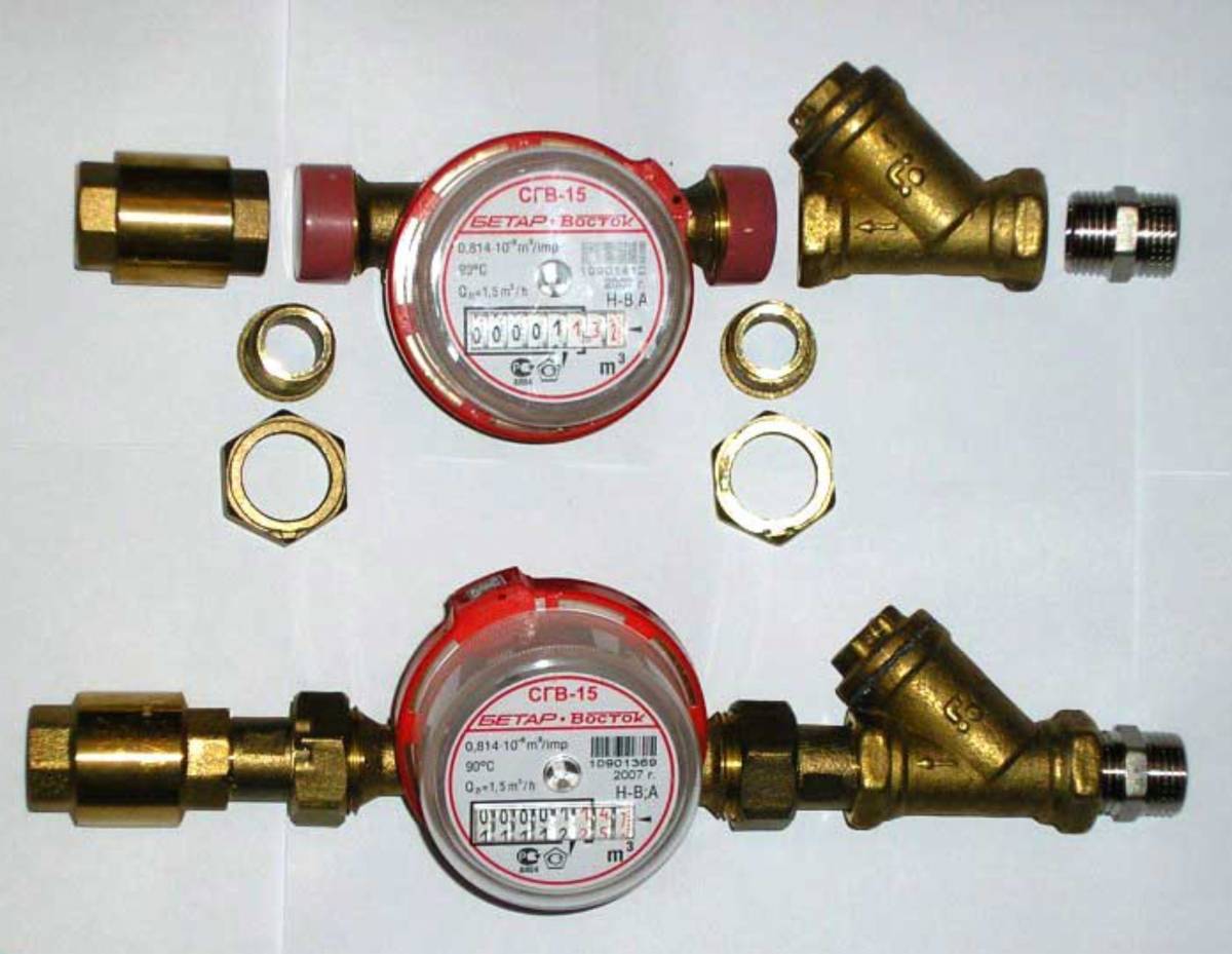 В момент приобретения устройства следует обратить внимание на комплектность поставки. Водомер должен быть укомплектован сетчатым фильтром, двумя соединениями, оснащенными ниппелями, гайками, прокладками и обратным клапаном