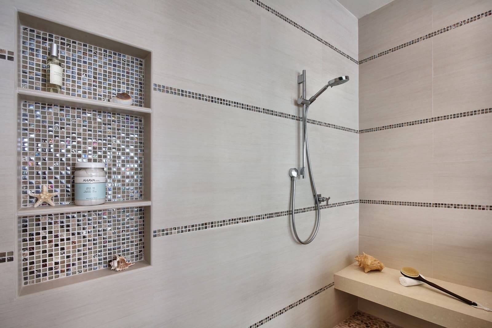 Для оформления душевого поддона, в целях безопасности следует подбирать противоскользящую мозаику с высокой влагостойкостью. По цветовому решению предпочтение отдают, как пастельным, так и ярким тонам, гармонично подчиненным доминирующему дизайну ванной.