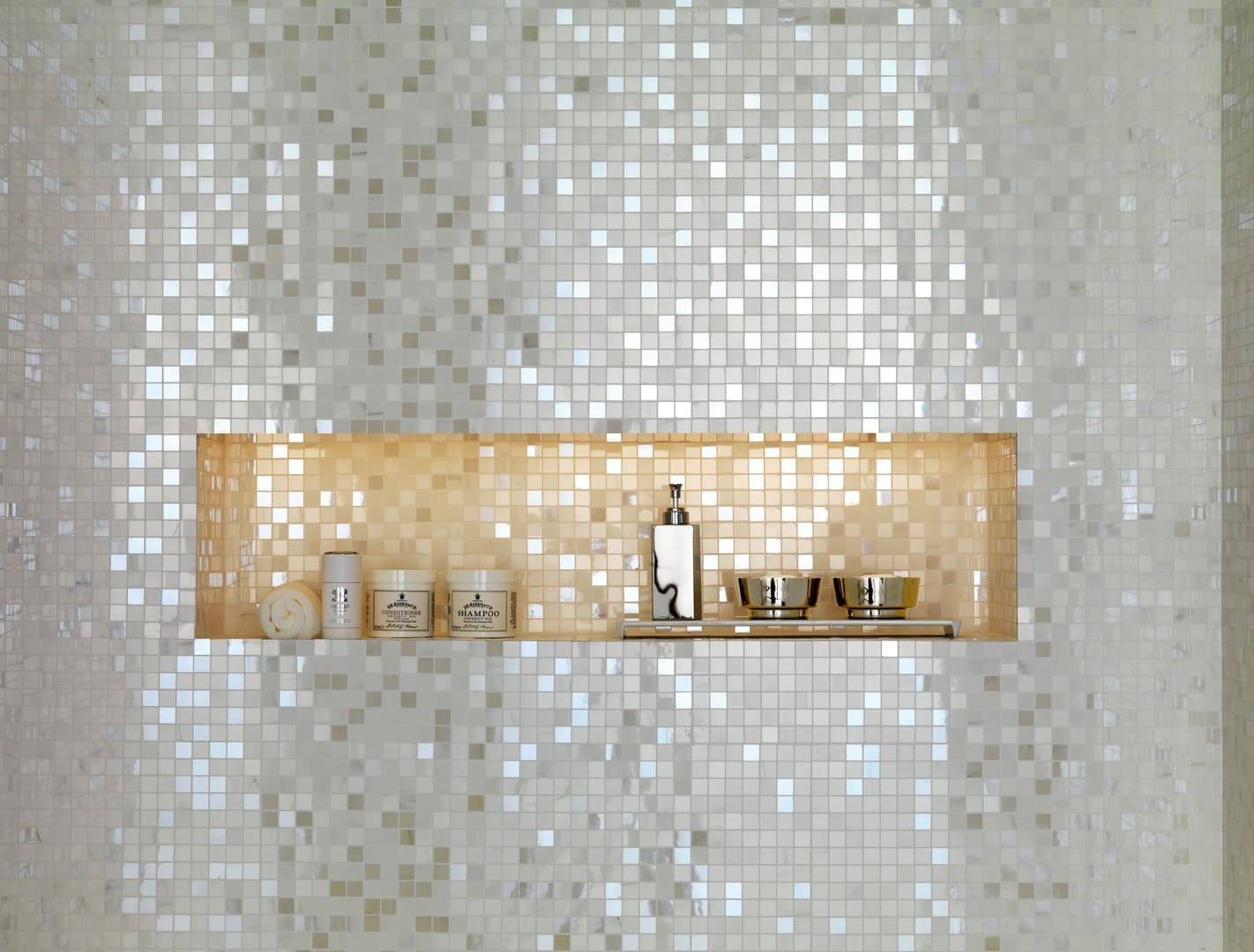 Является достаточно эффектным выбором, привносящим в интерьер интересные штрихи. Серебристая мозаичная плитка, одинаково хорошо смотрится, как при полном, так и при фрагментарном декорировании поверхностей.