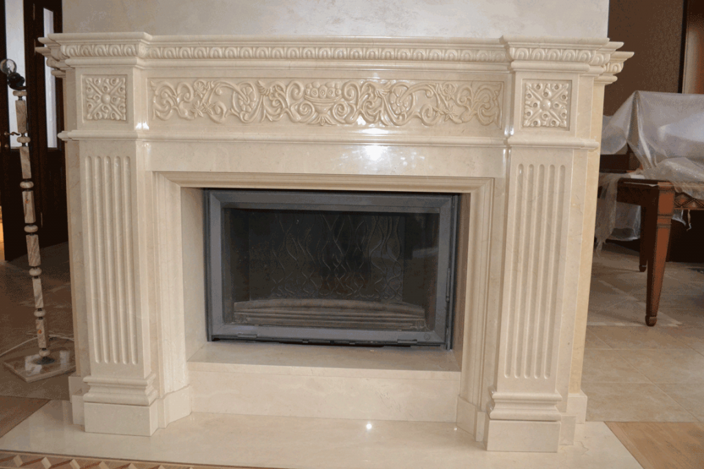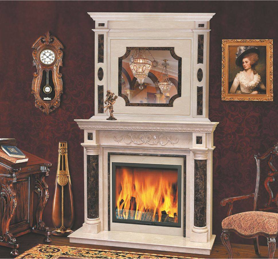 Каминный портал из мрамора: использование для оформления поверхности гладкой плитки, колон, скульптур и прямых деталей