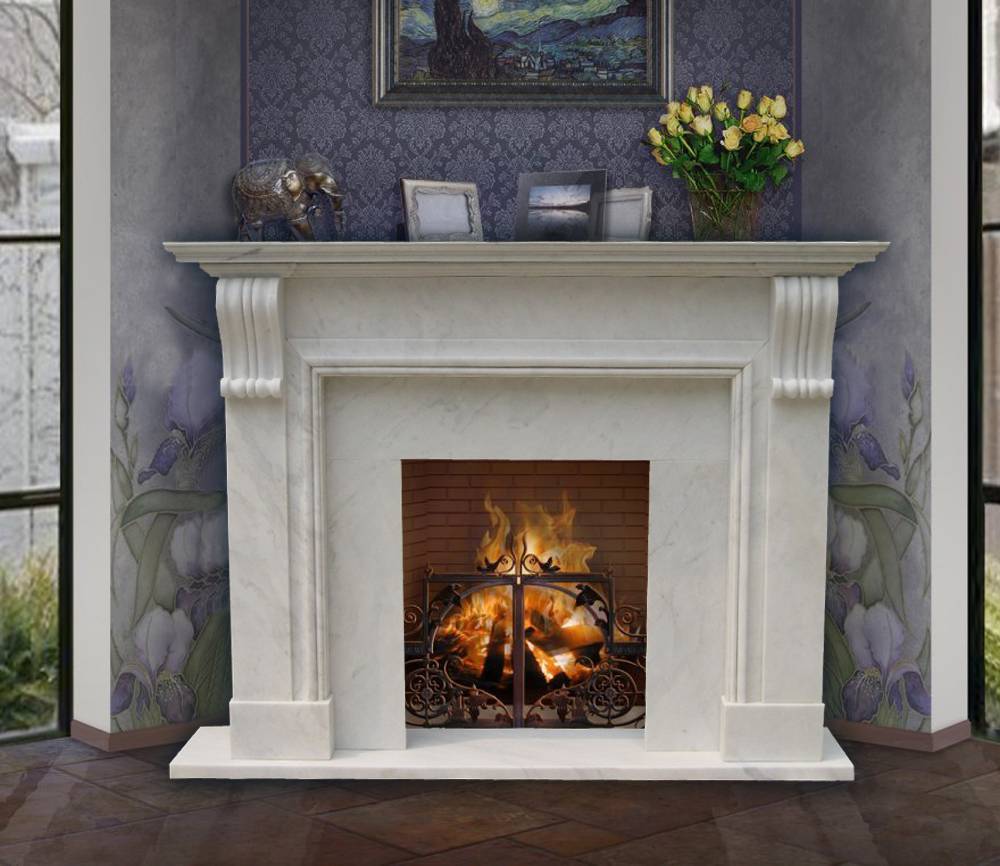 Пристенный очаг с обрамлением из белого мрамора, со слабо выраженным рисунком и глянцевой поверхностью