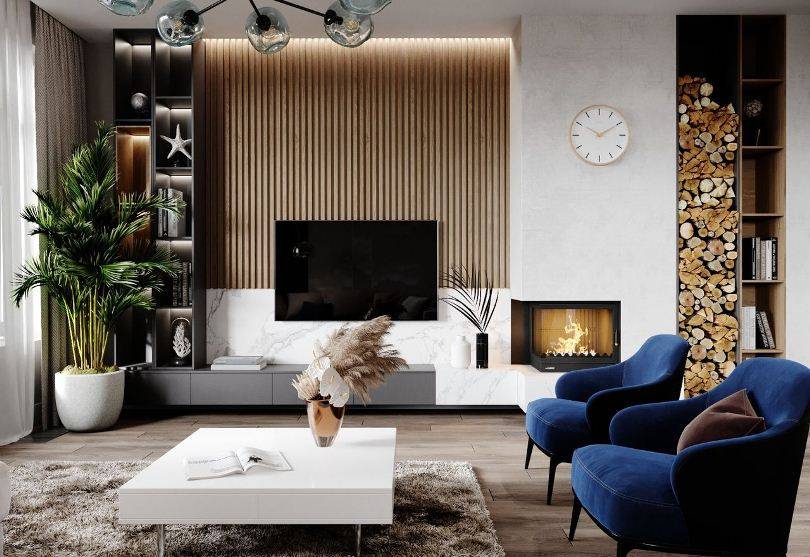 В такой ситуации его можно зонировать, разделив посредством модуля из дерева, разных напольных покрытий и светильников.